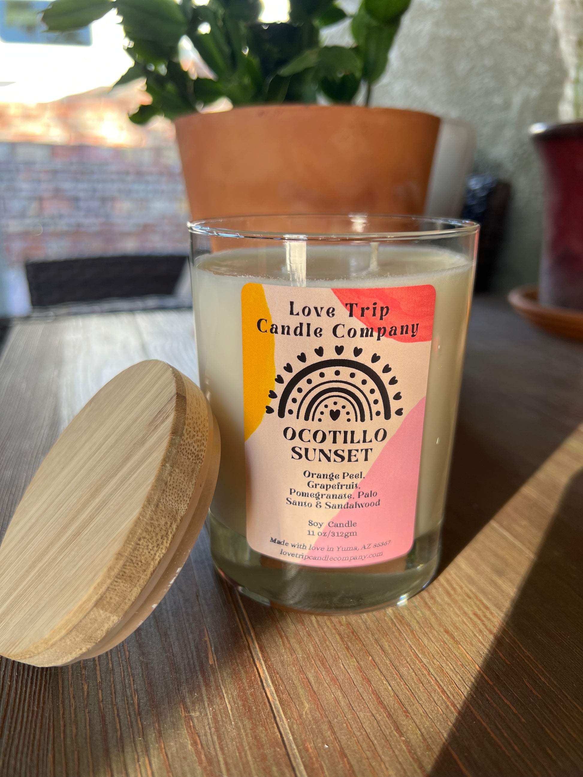 Our Ocotillo Sunset candle is made from 100% soy wax. This candle has some unique notes of Orange Peel, Grapefruit, Pomegranate, Palo Santo and Sandalwood. .It reminds me of a smokey sunset in the Southern California Desert. The perfect candle to take camping with you. It contains clean fragrance oil, non-toxic, no paraffins or phthalates and is 100% Vegan.
